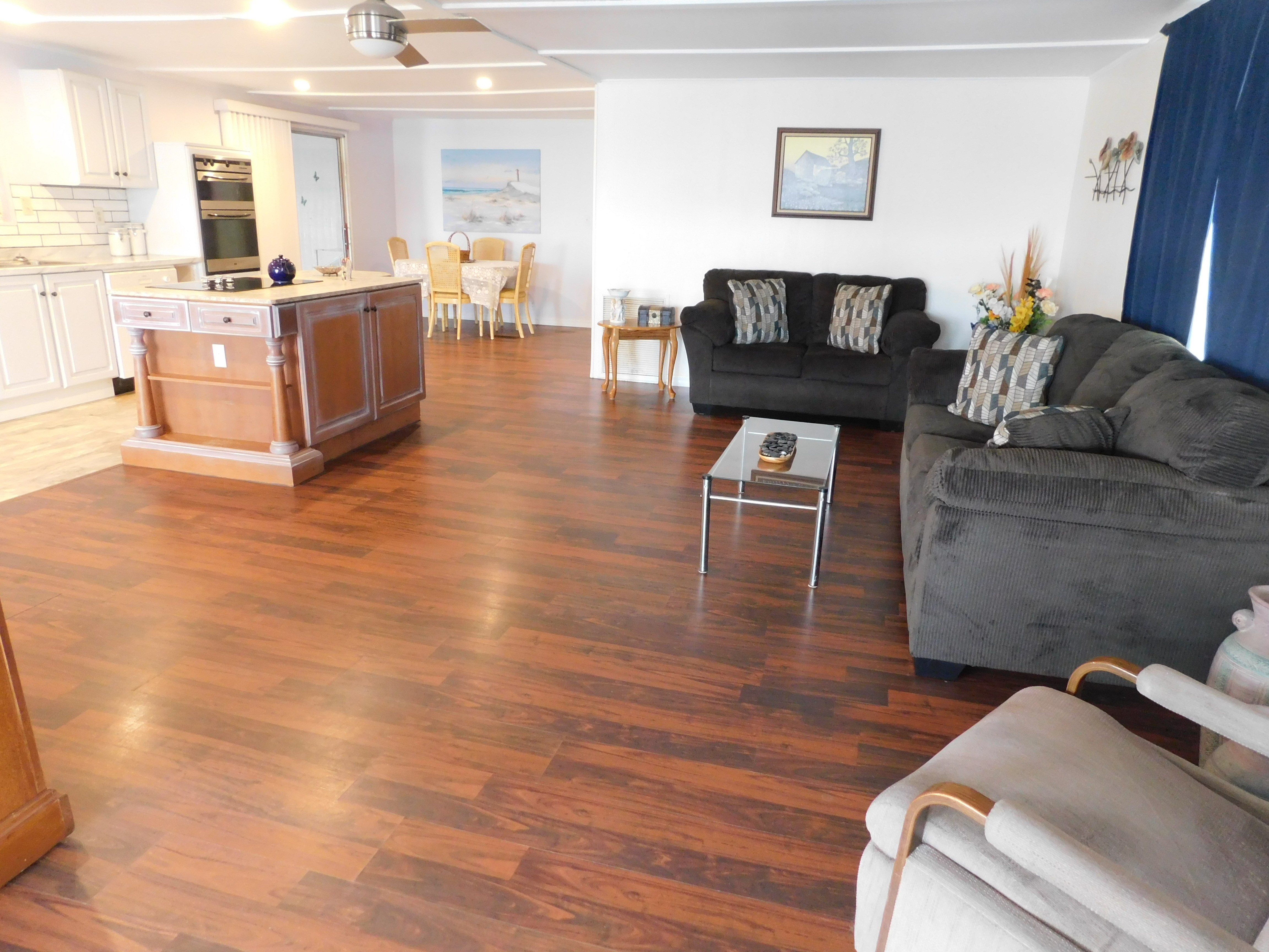 You need space? This one's for you! Immaculate 2 bedroom, 2 bath home offers 1416 square feet of spacious open concept living space in the main home plus accessory spaces including a 12' x 17' enclosed lanai and a 12' x 18' storage room with laundry. This sprawling floor plan features gorgeous laminate flooring accented by plentiful natural light with large bay windows across the front of the home. The main home entry opens into an amazing 12' x 22' space that communicates with the formal living area and kitchen through large open doorways and serves as a den or informal living area. The formal living area measures 16' x 20' and shares a great room layout with the kitchen on the opposite end of the room. Demarcating the line between formal living and the kitchen stands an exquisite vintage wood island with flat stove cook-top. The kitchen offers room for multiple cooks and is attractively clad with white cabinets, white appliances, and white marbled countertops; all accented beautifully by white subway tile style backsplash. The dining room is situated adjacent the kitchen and provides access to the enclosed lanai through double glass sliding doors. From the dining room, one can fully appreciate the openness and flow of unimpeded space through the great room living area and kitchen, through the large open doorways, to the den/informal living area on the front end of the home. The master bedroom occupies the full width of the entire back end of the home and is outfitted with large double mirrored sliding door closets, and a private bath ensuite with walk-in shower. The guest room measures 9' x 12' and sits adjacent the updated main hall bath which includes a tub-shower combo. The enclosed lanai can be accessed through the main home sliding glass doors or by separate entrance from the carport. The lanai currently serves as a fitness room outfitted with a universal weight machine, recumbent bike, and full sized heavy punching bag; all of which will stay with the home. The back door of the lanai opens into a large storage room which includes laundry washer and dryer and built in shelving. All this space is perfectly protected by a new roof that was installed less than 2 years ago. Also, the home was tented for termite/pests approximately 3-4 months ago and retains a transferrable warranty available to the new owner. This home sits on a large corner lot and is within walking distance (less than 1/10th of a mile) from the North Clubhouse, pool, hot tub/spa, and other amenities. If you need a large living space; if you appreciate open concept; this is your home. Call for a showing today. Woodbrook Estates is an active, pet-friendly, 55+ adult community. The monthly lot rent includes land-lease and use of all amenities for $827. (No Additional Taxes.)