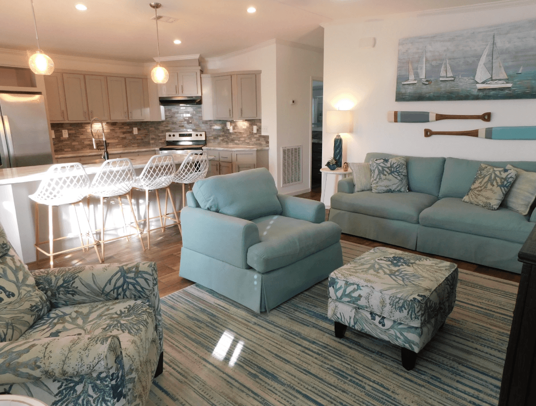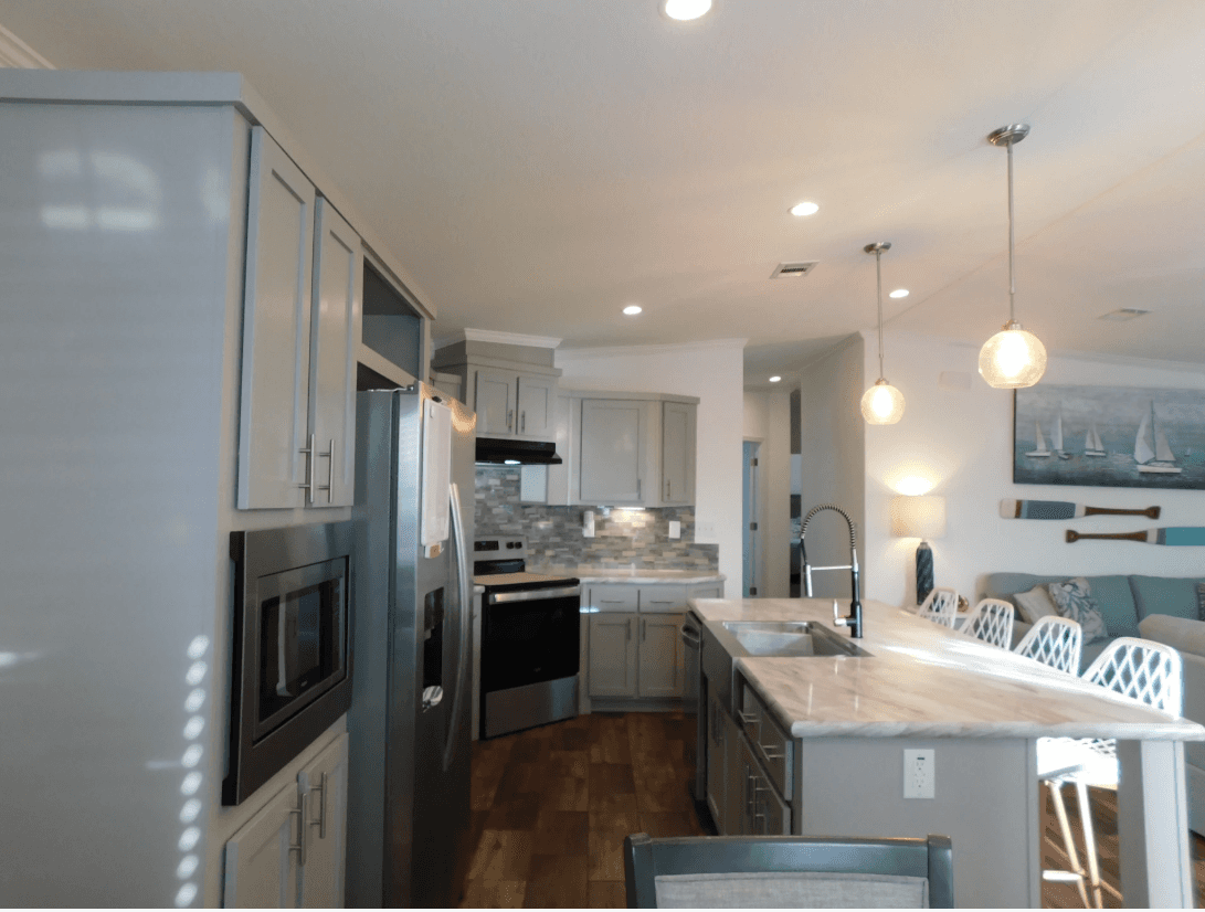 Welcome to this lovely cottage-style home, nestled in the tropical setting of Hawaiian Village. With 3 bedrooms and 2 baths, this mostly furnished residence is designed to please from the moment you pull into the driveway and step onto the charming front porch. Inside, an open floor plan creates a warm and inviting atmosphere. The furnished living room includes a comfortable power recliner, while the thoughtfully designed kitchen features beautiful stainless-steel appliances, a built-in microwave, and a neutral brick-look tile backsplash that complements the custom cabinetry and striking hardware. A large center island-with seating for four-sits across from the farmhouse sink, making the kitchen both practical and stylish. Adjacent to the kitchen, the dining room offers an ideal space for evening gatherings and effortless entertaining. The generously sized primary bedroom easily accommodates the adjustable king-sized bed and includes a spacious walk-in closet. The primary bath features double sinks with custom cabinetry and a sleek, glass-enclosed shower. The second bedroom is also generously sized with its own walk-in closet, while the third bedroom offers versatility as an office, guest room, or hobby space-whatever suits your lifestyle. Convenience continues with an indoor laundry area complete with washer and dryer. Step just outside the laundry door to a large screened-in lanai, perfect for relaxing or entertaining. Attached to the lanai is a dream workshop area equipped with toolboxes, countertops, and wall cabinetry-ideal for projects, storage, or creative pursuits.